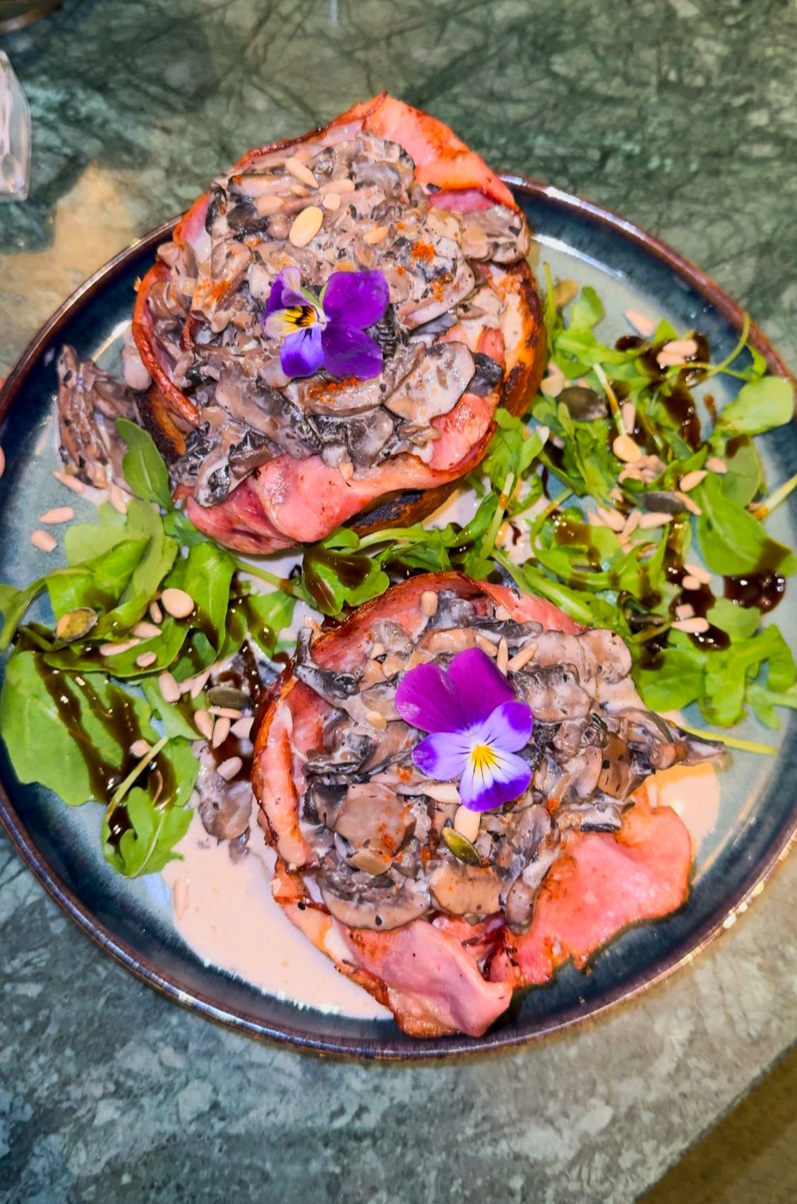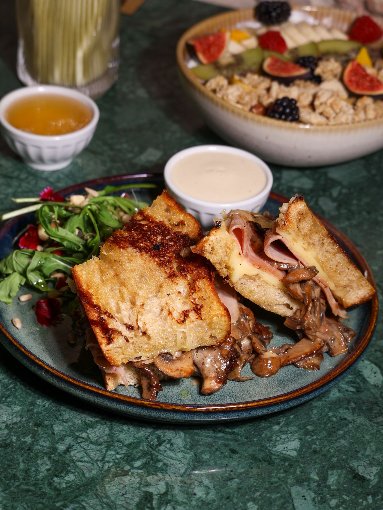 Croissant garni de bacon de veau grillé, œuf poché, fromage frais, et le tout enveloppé d’une sauce aux champignons onctueuse.