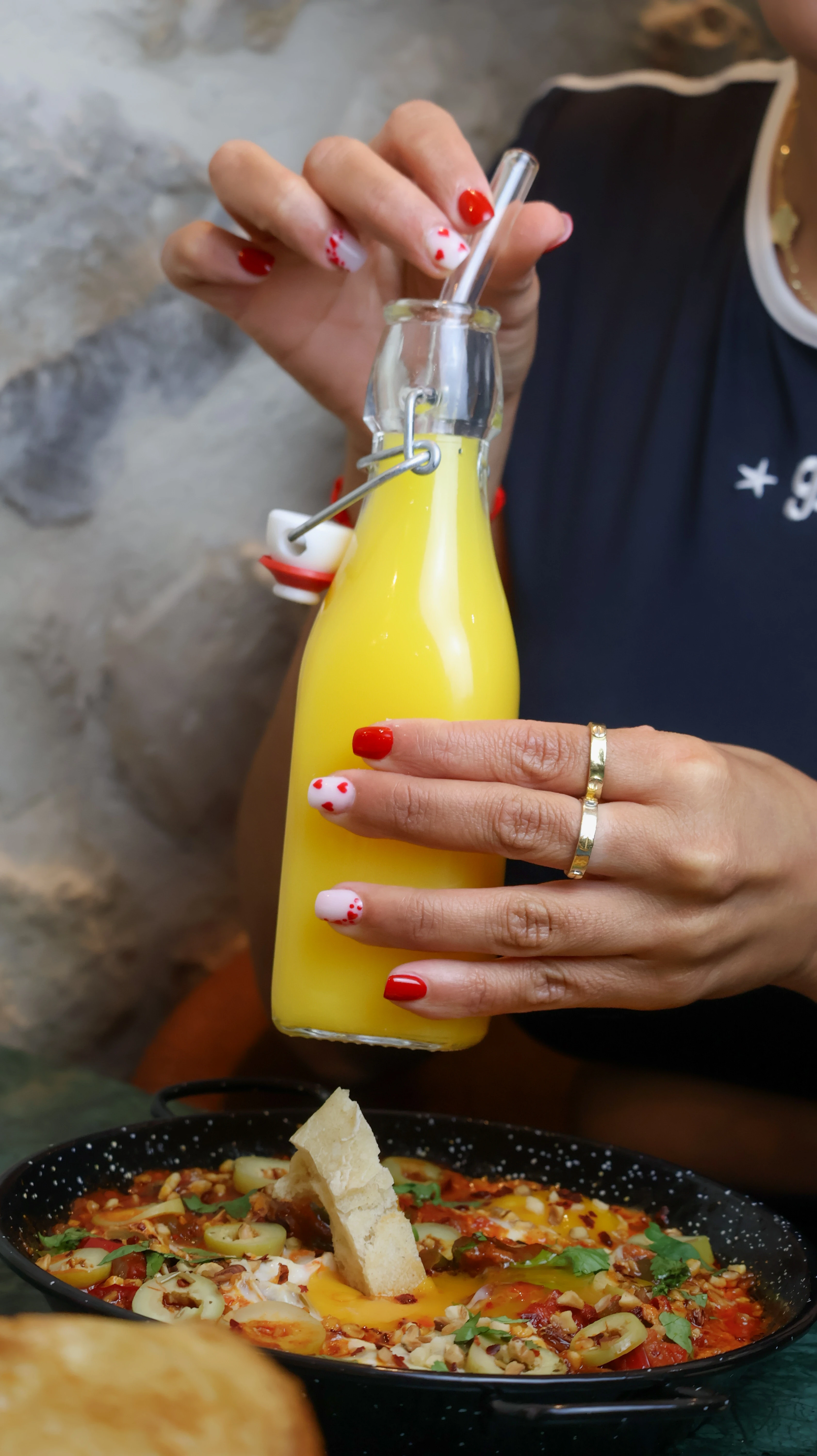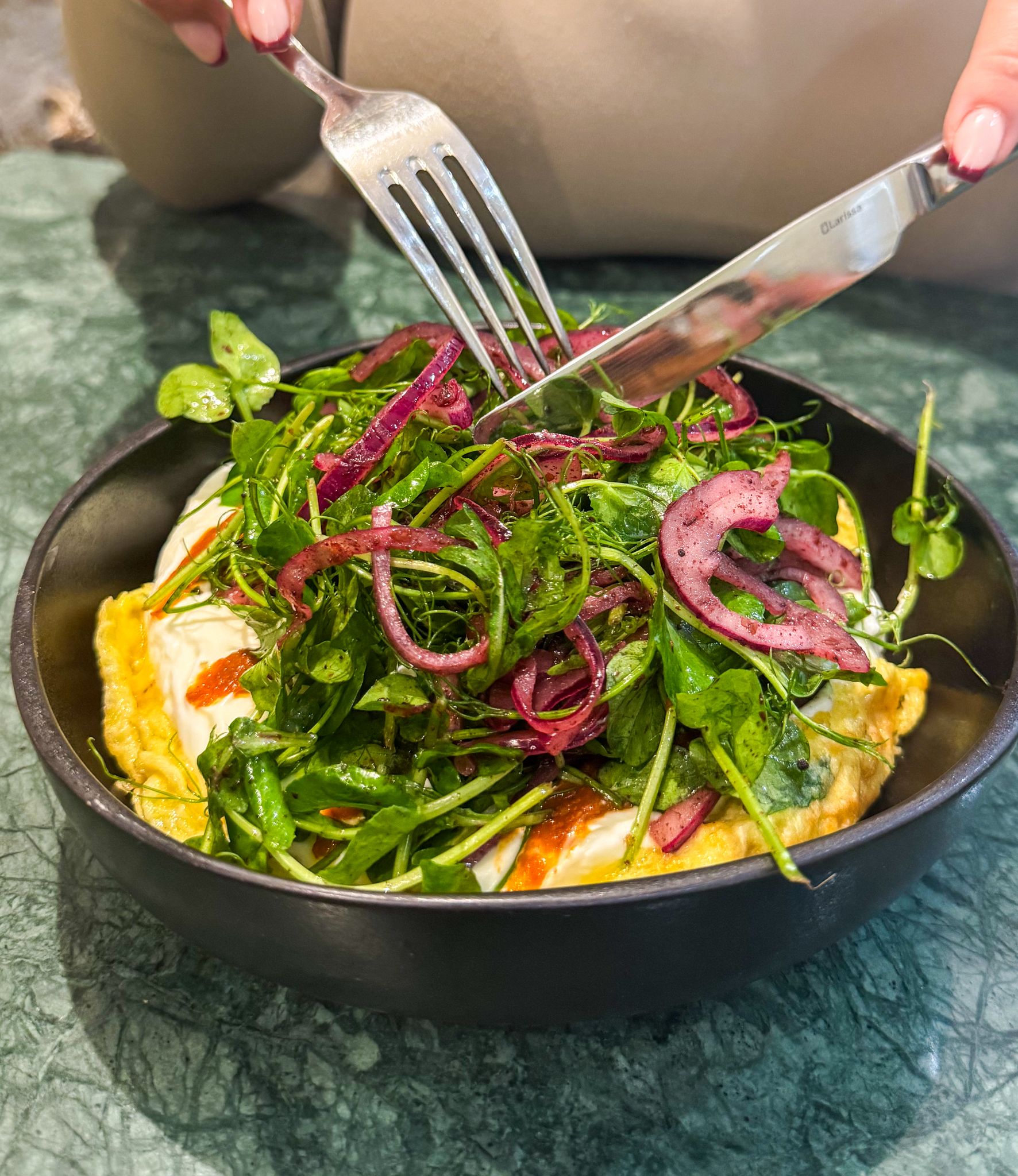 Omelette moelleuse relevée de harissa, garnie de fromage frais et de pousses croquantes, dans une alliance parfaite entre tradition et modernité.
