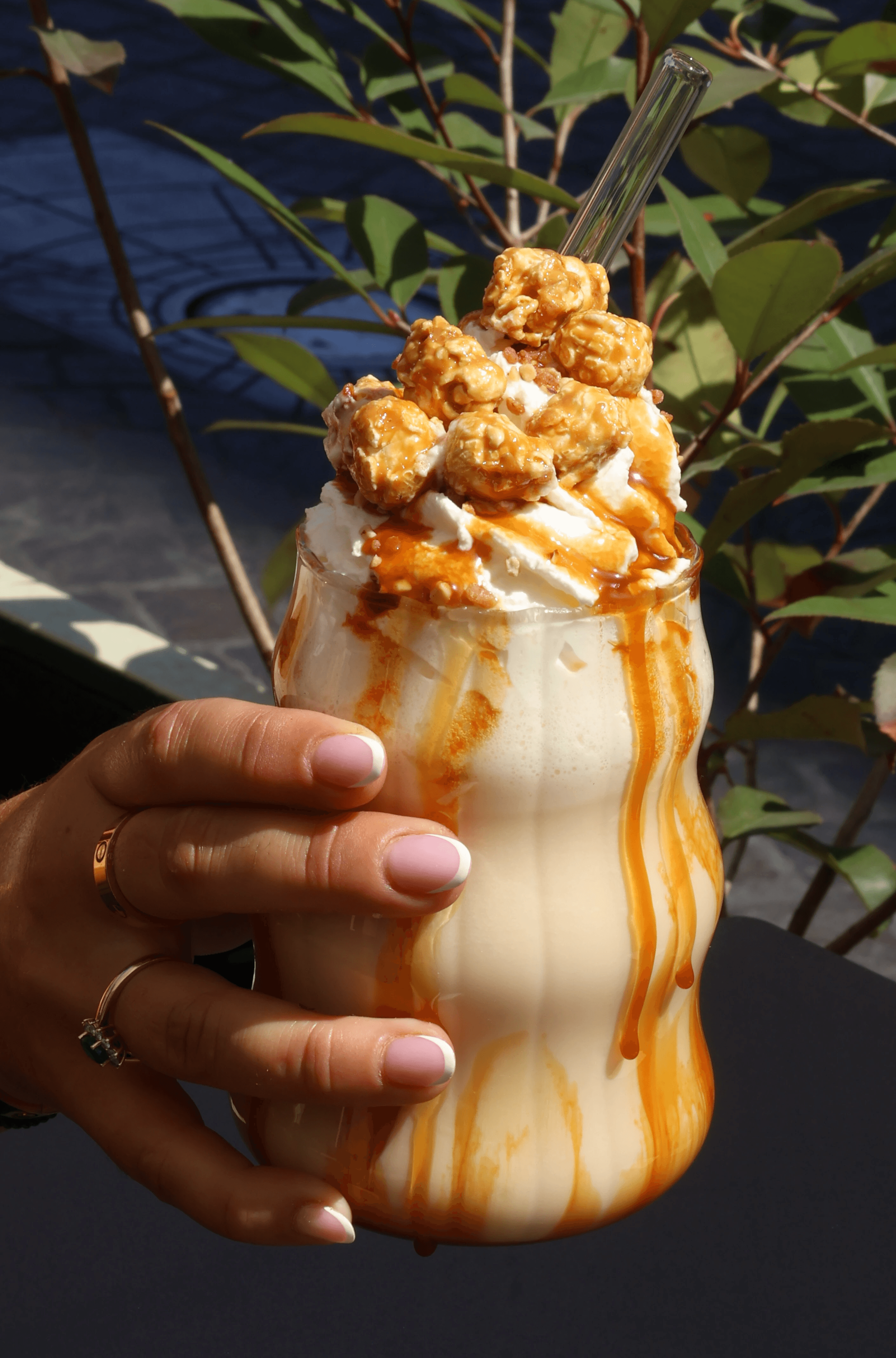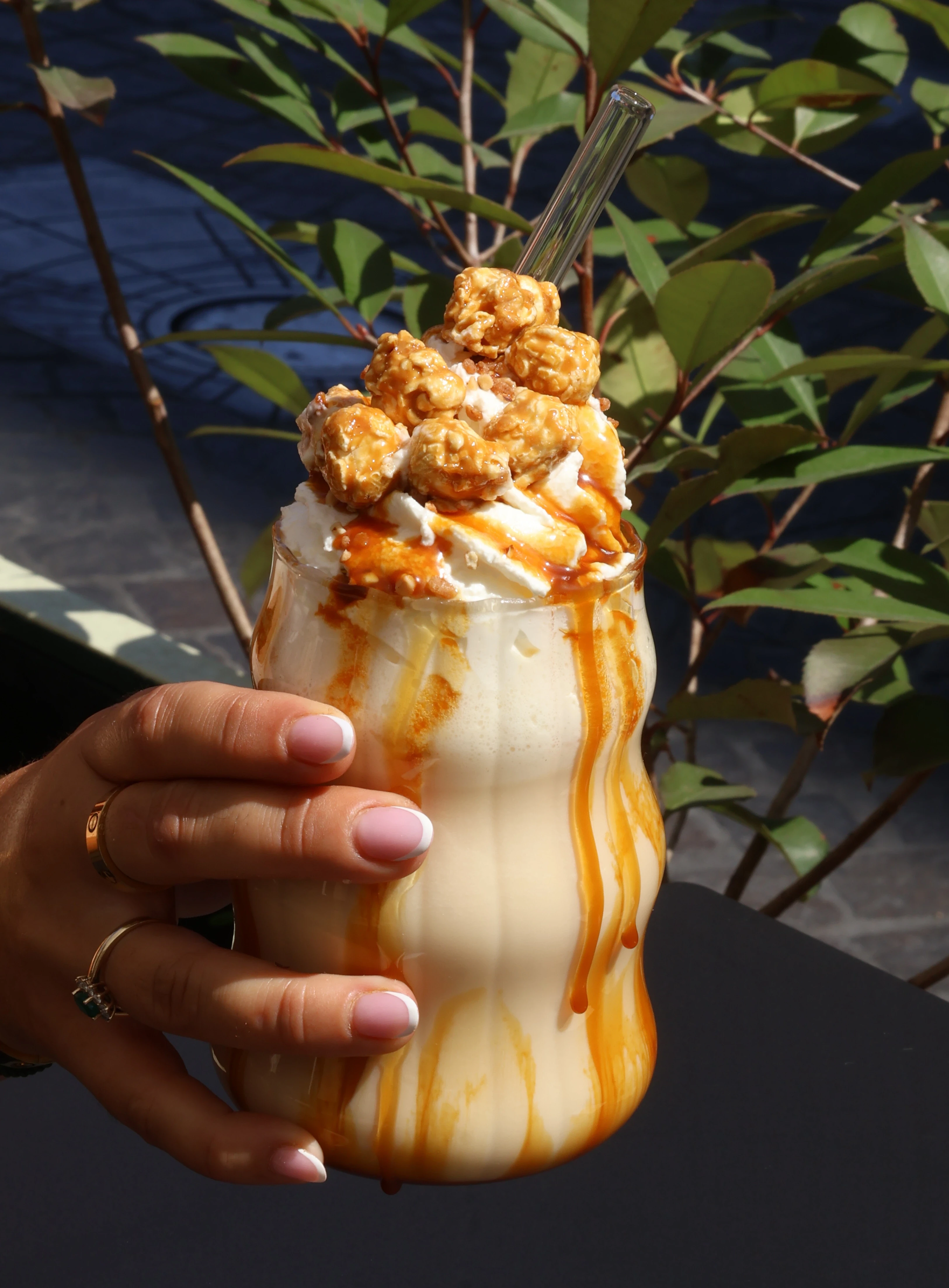Une boisson réconfortante à base de lait texturé, de café et de caramel onctueux, surmontée d’une montagne de chantilly et de popcorn croustillant. À déguster chaud ou froid ( Lait végétal +1 ).