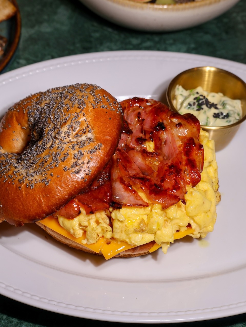 Bagel doré aux graines de pavot, garni d’œufs brouillés fondants, de bacon caramélisé avec son cheddar fondant. Servi avec sa sauce fromagère maison aux herbes et au sésame.