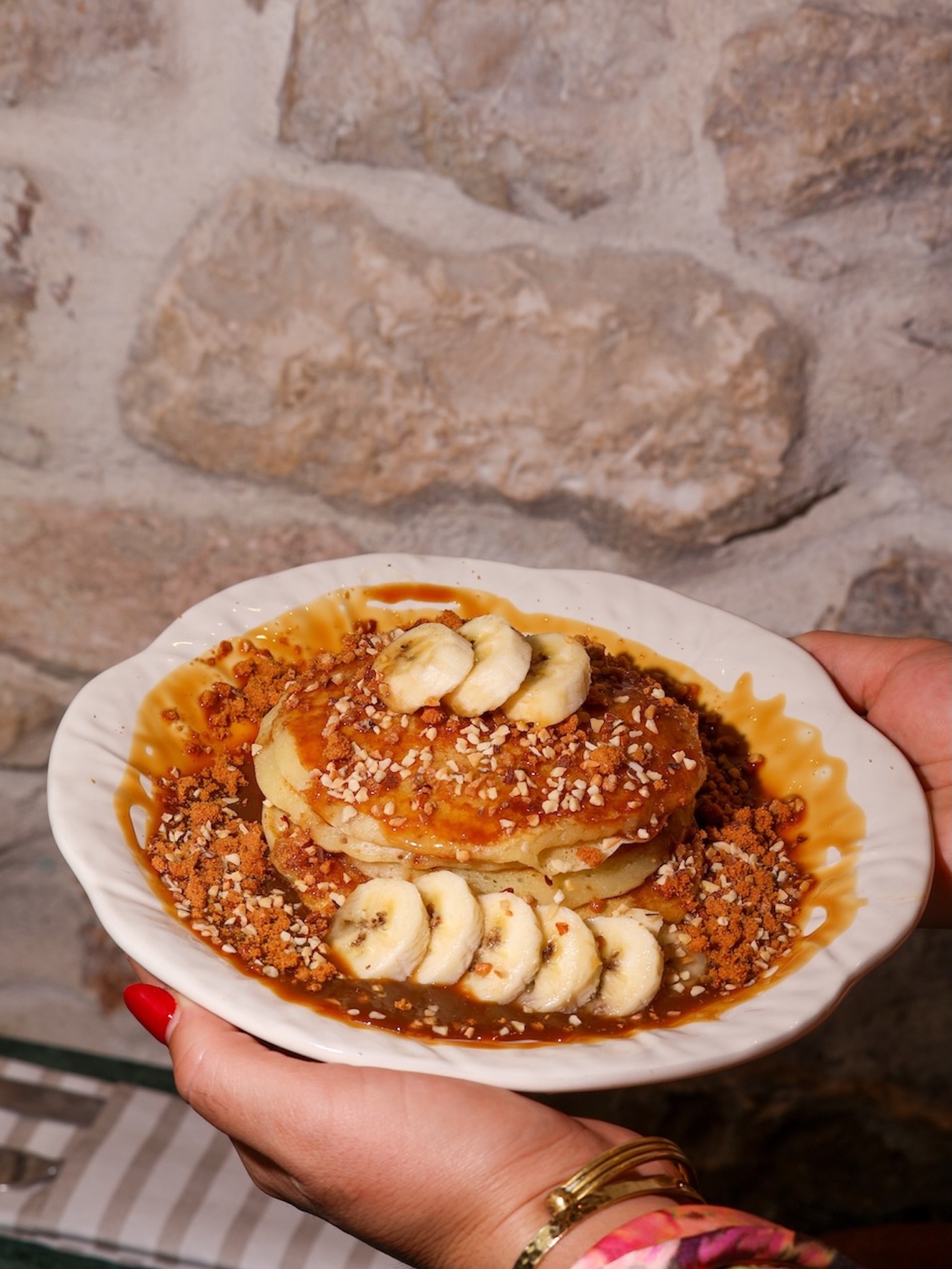 Pancakes moelleux nappés d’un caramel, garnis de banane fraîche et parsemés d’éclats de spéculos croustillants. Une douceur inspirée du célèbre dessert Banoffee, réconfortante et décadente.
