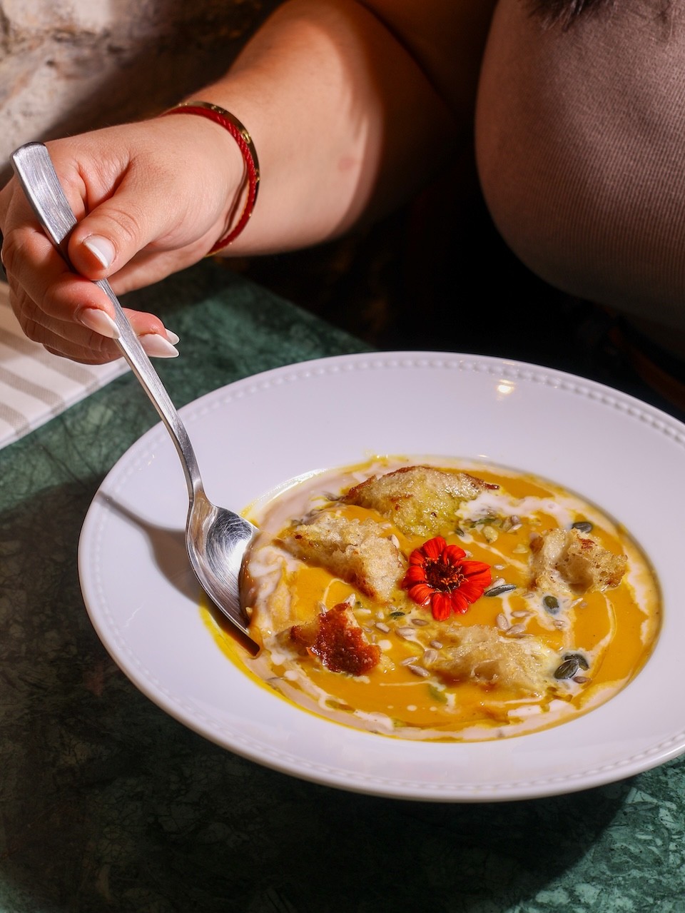 Velouté onctueux de butternut et de patate douce, relevé d’une touche de crème de coco et garni de croûtons dorés à l’ail. Le tout agrémenté de graines torréfiées et d’une fleur comestible.