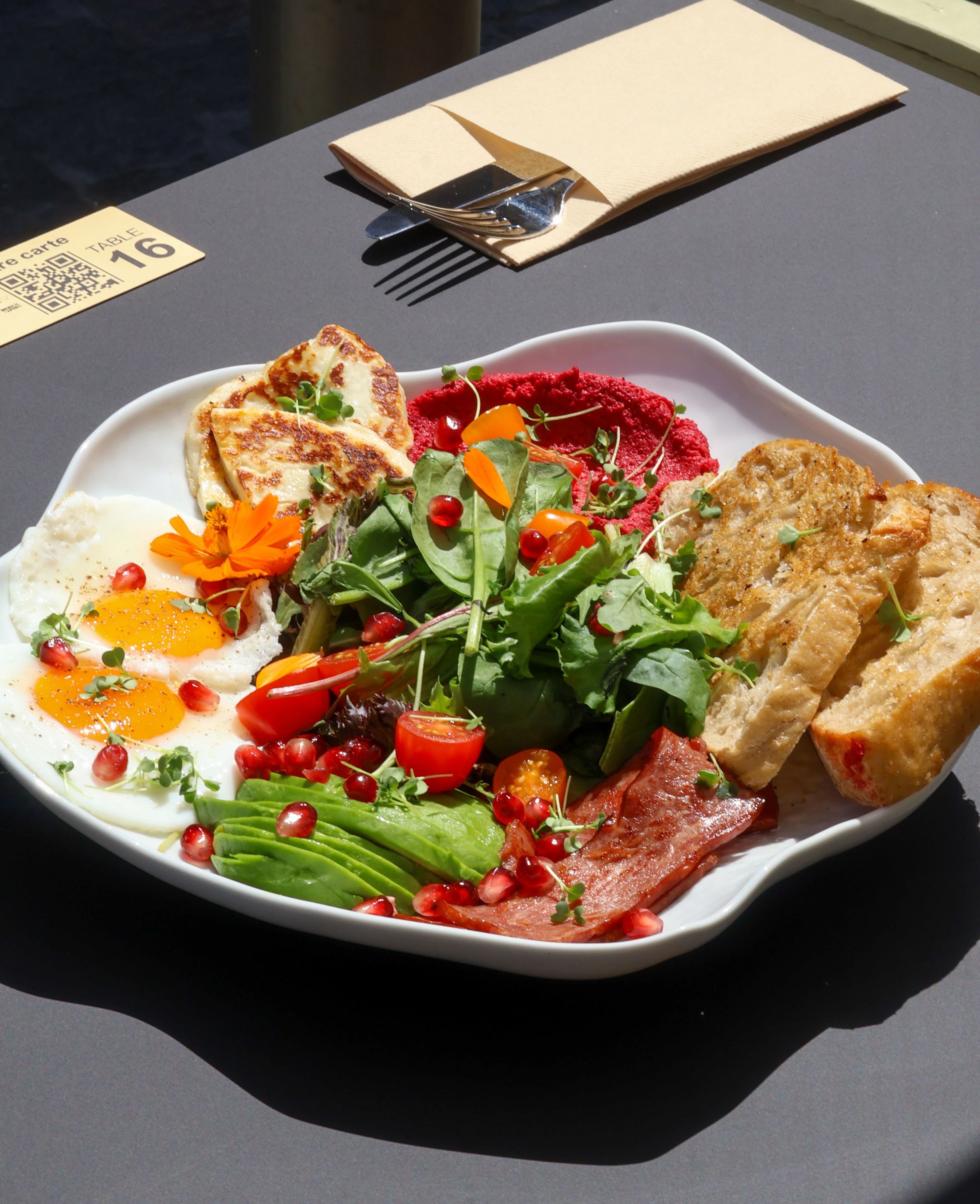 Charcuterie savoureuse, fromages variés, œufs au choix (brouillés ou au plat), avocat, houmous onctueux (betterave ou nature), tomates cerises, salade et pain toasté.