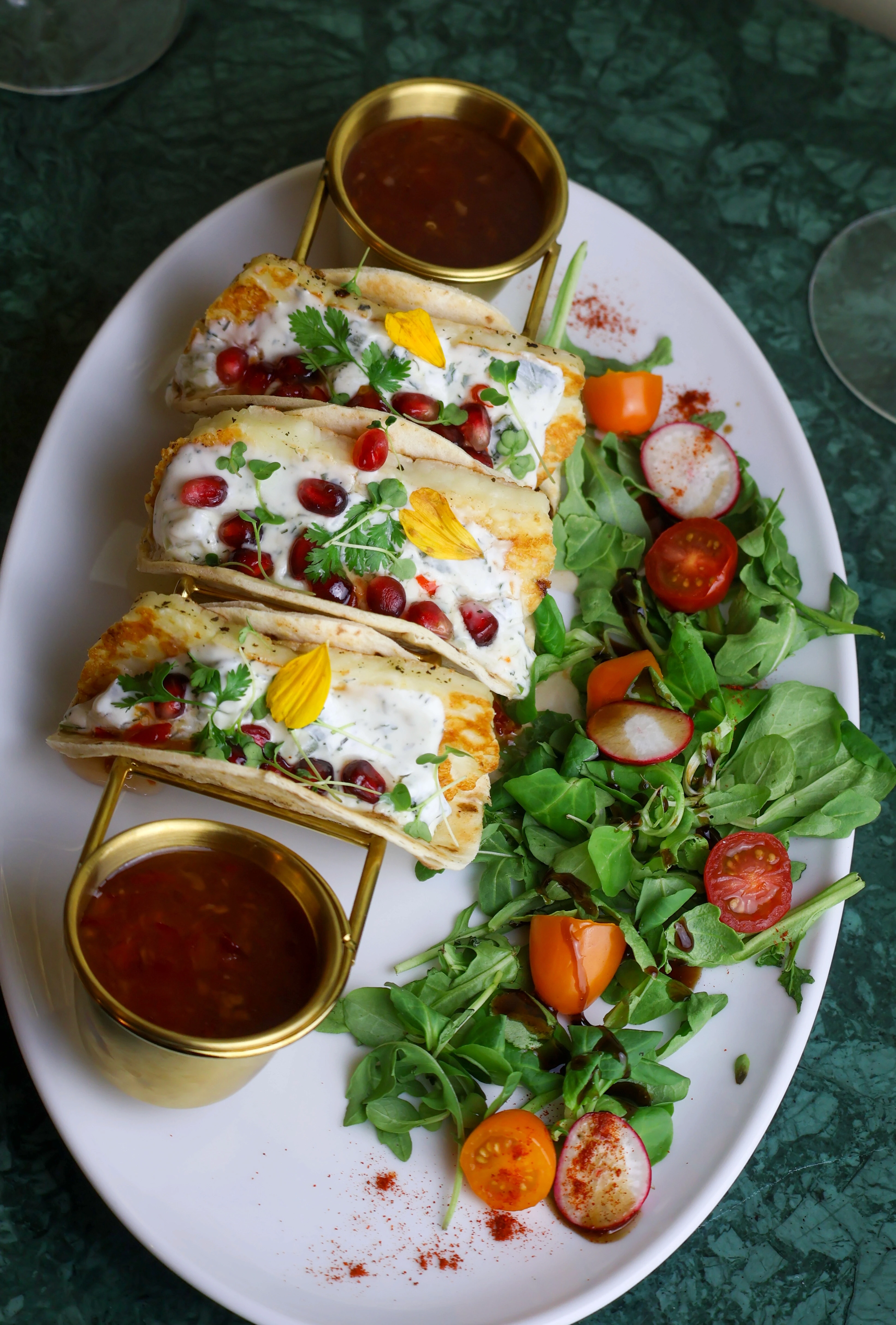 Tacos croustillant et moelleux, sublimés d’une crème herbacée et de perles de grenade, parsemés de pétales floraux. Le trio gourmet par excellence.