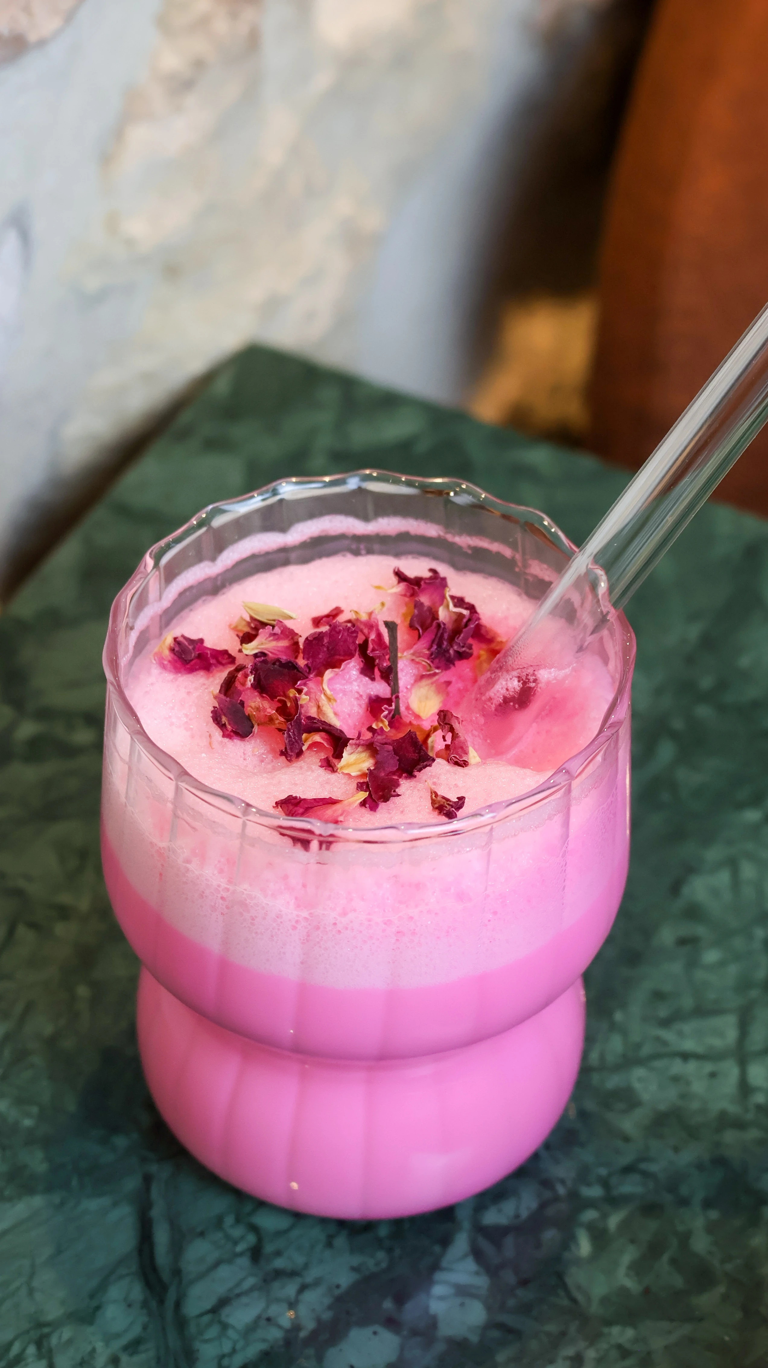 Mariage délicat de sirop de rose et de poudre de betterave, sur une base de lait onctueux couronné de pétales de rose séchée. À déguster chaud ou froid ( Lait végétal +1 ).