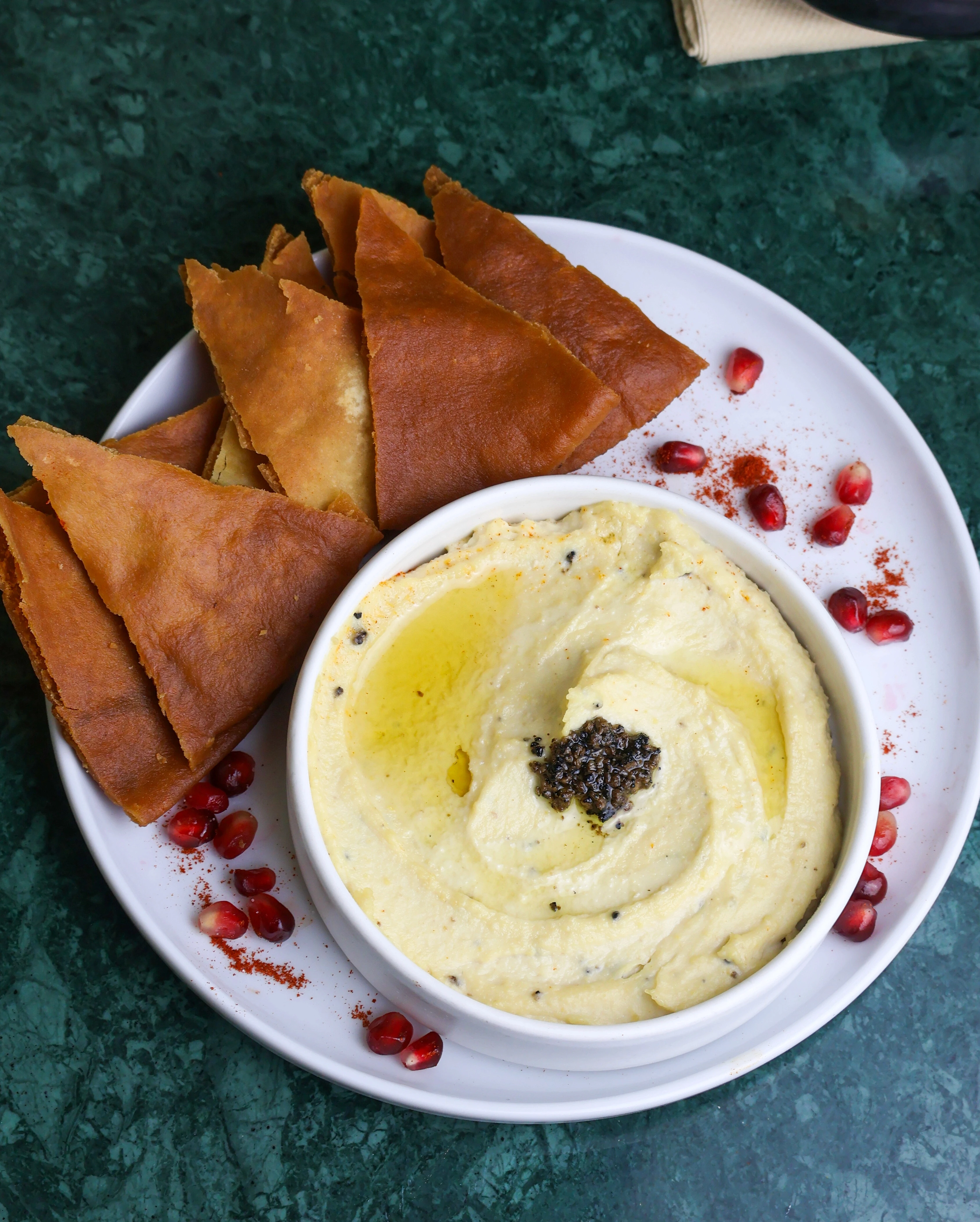 Houmous ultra onctueux à la truffe noire, arrosé d’un filet d’huile d’olive, accompagné de chips de pain pita dorées et croustillantes. Un dip chic et addictif.