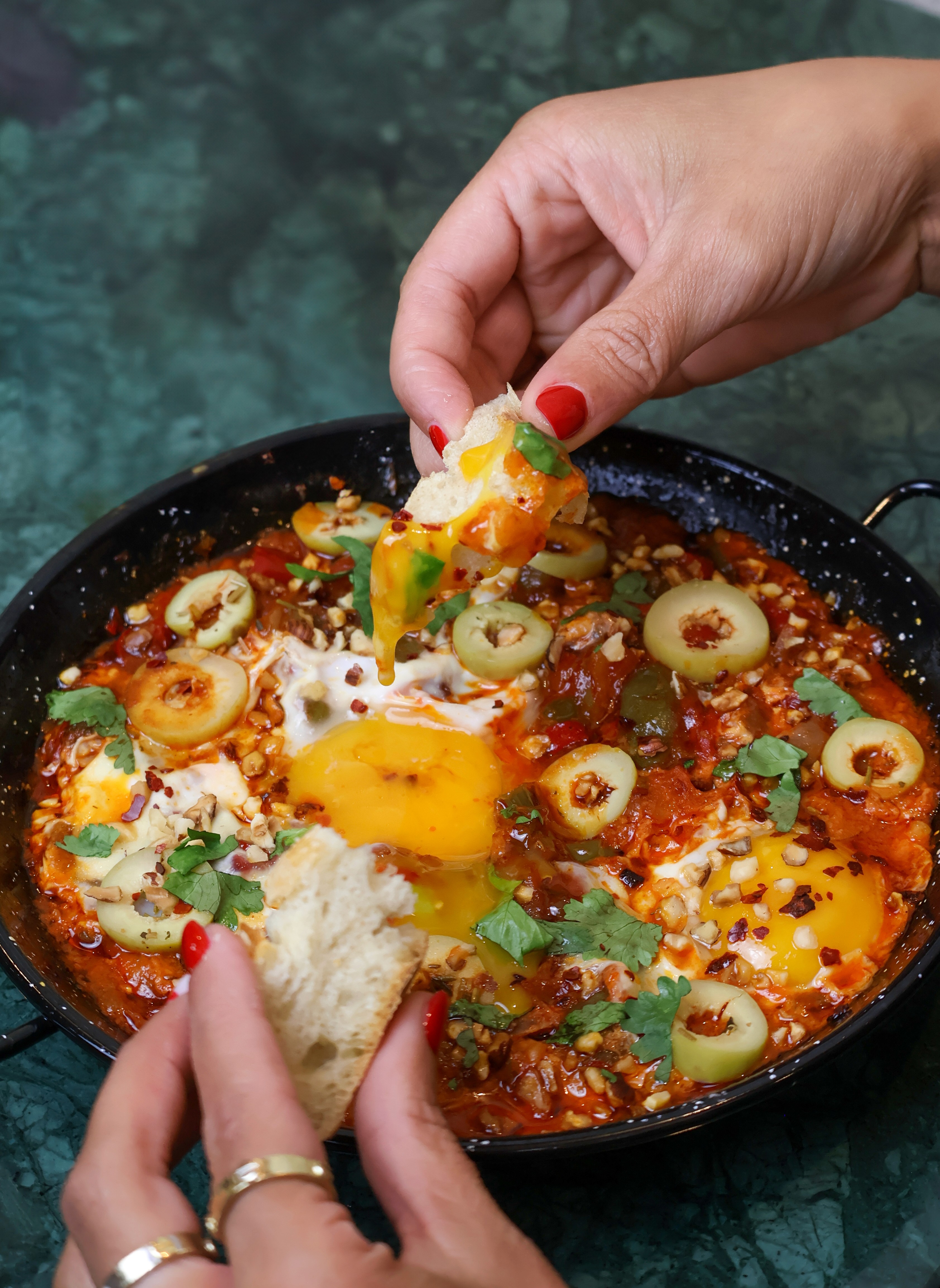 Chakchouka de Maman, 2 œufs, Huile d’olive marinée, Piment paillettes, Noisettes grillées, Olive, Persil, Baguettines céréales