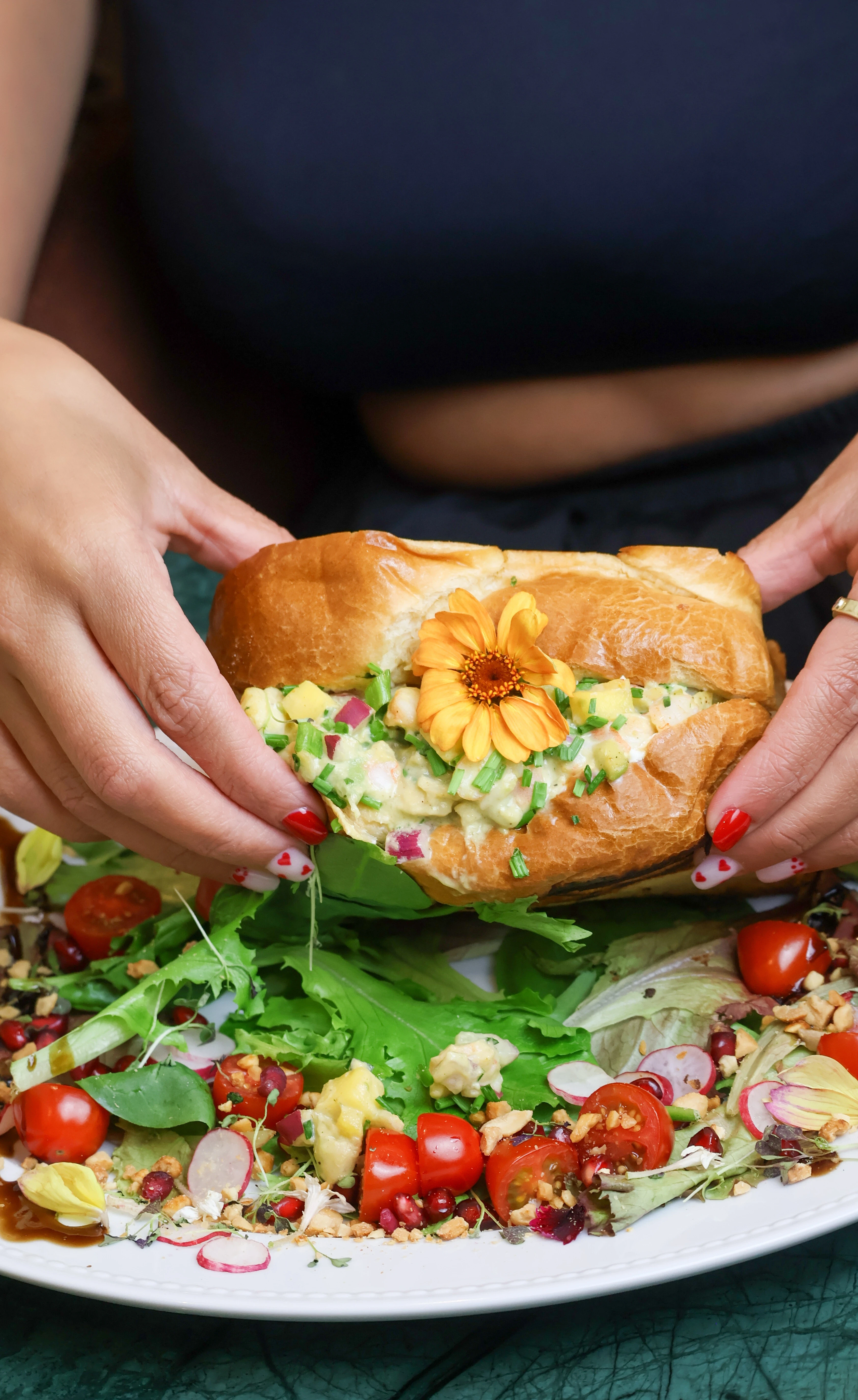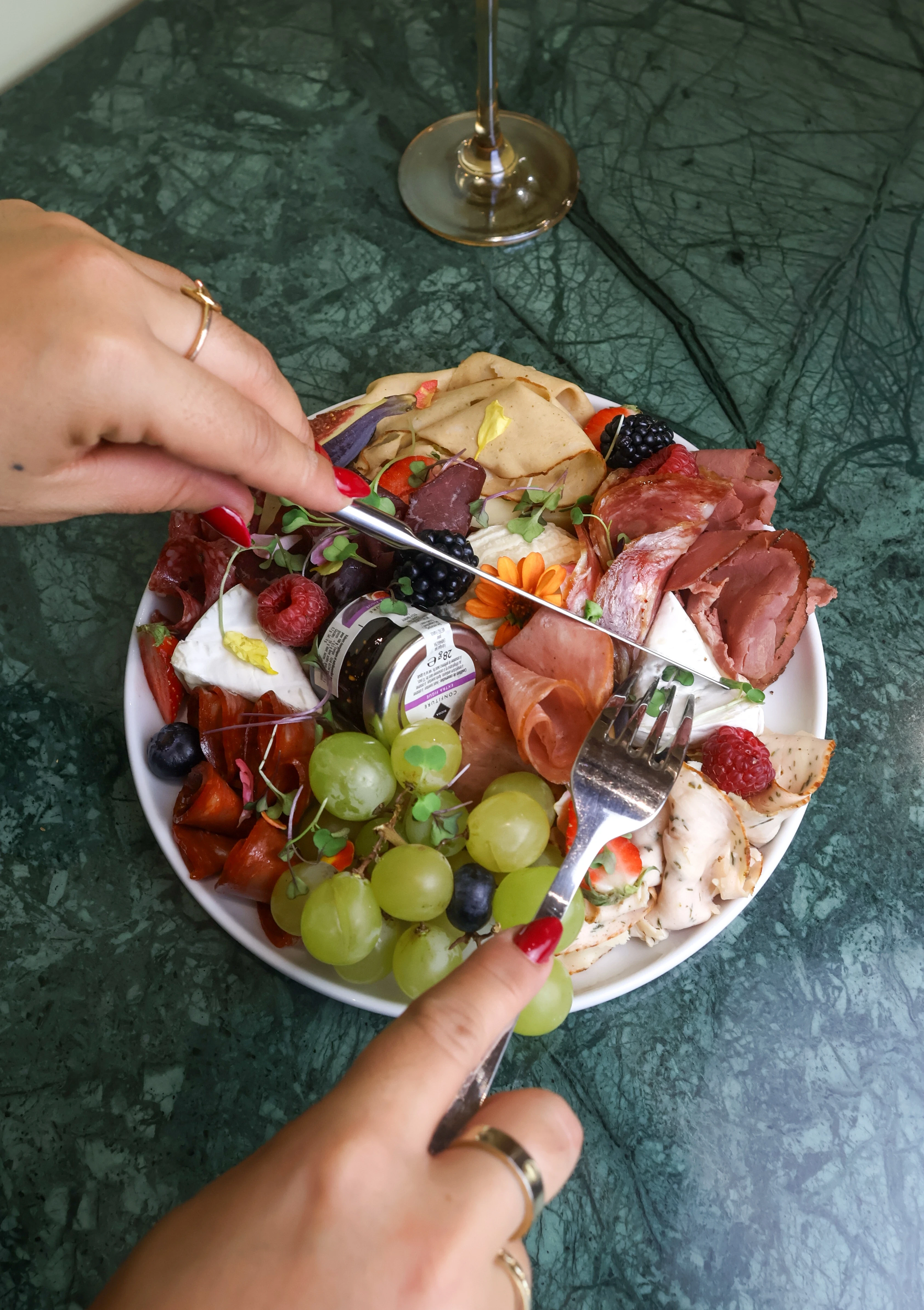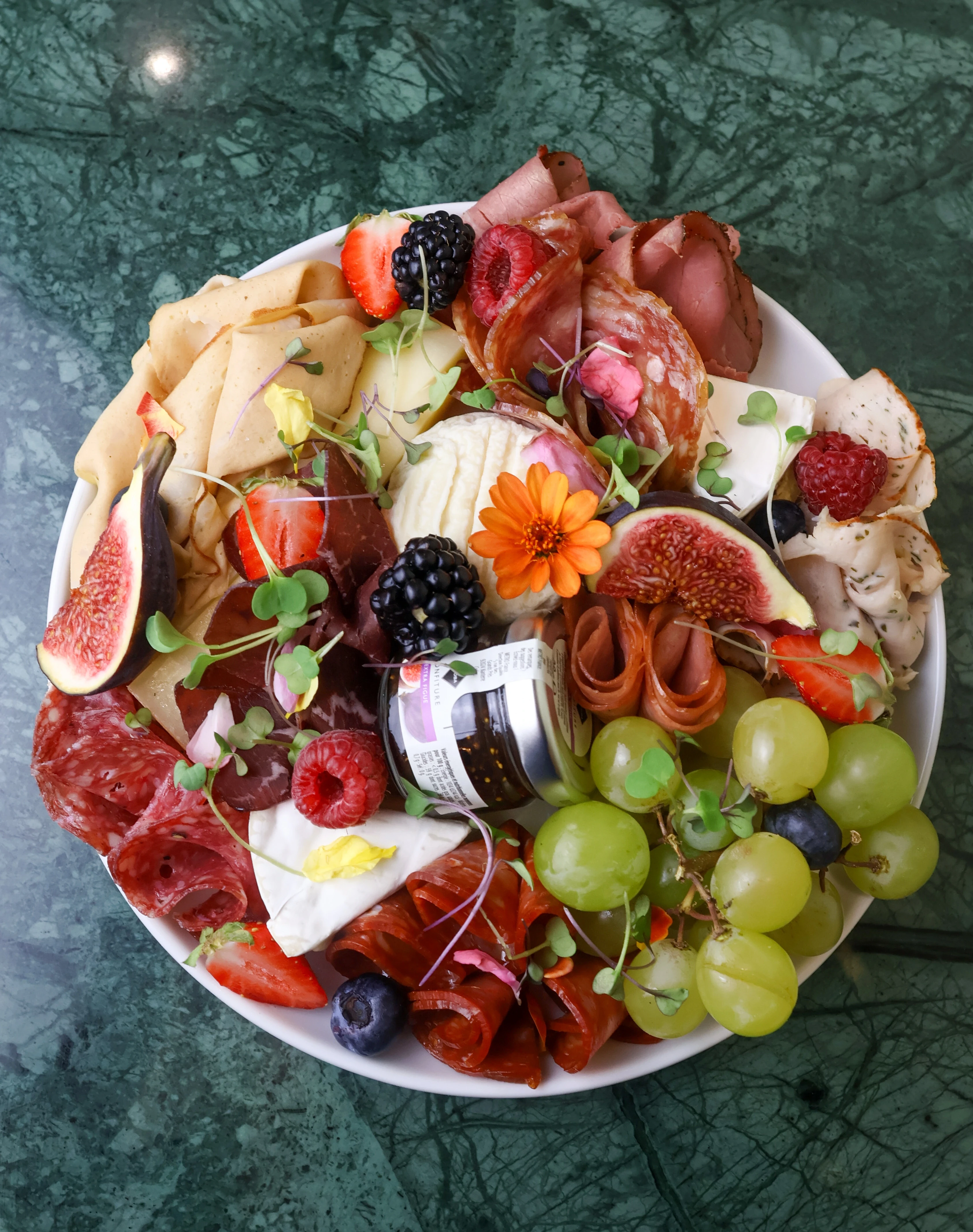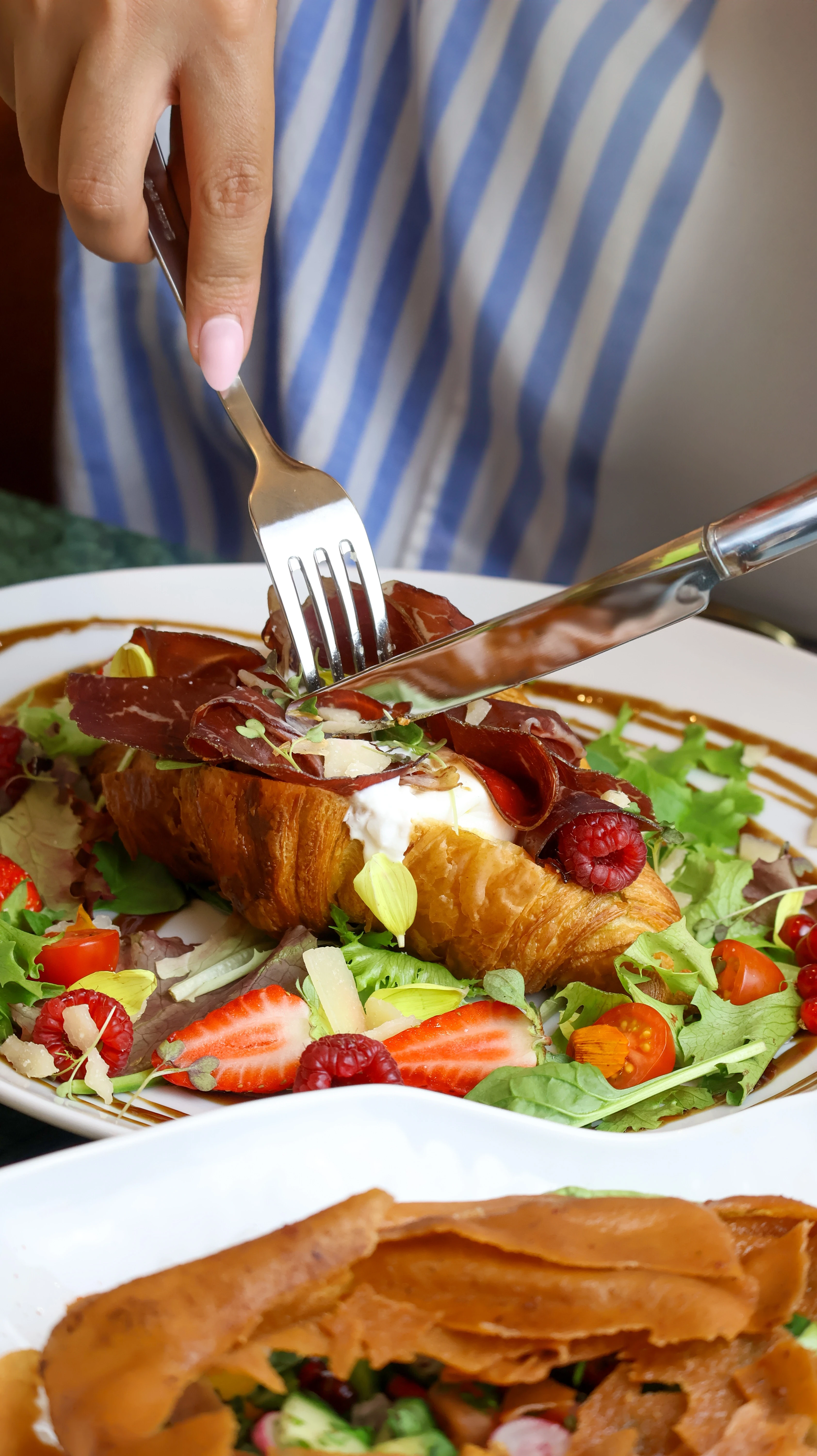 Un croissant feuilleté garni de burrata crémeuse, bœuf séché, pesto maison et roquette fraîche. Le tout sublimé par des tomates cerises, framboises et fraises.