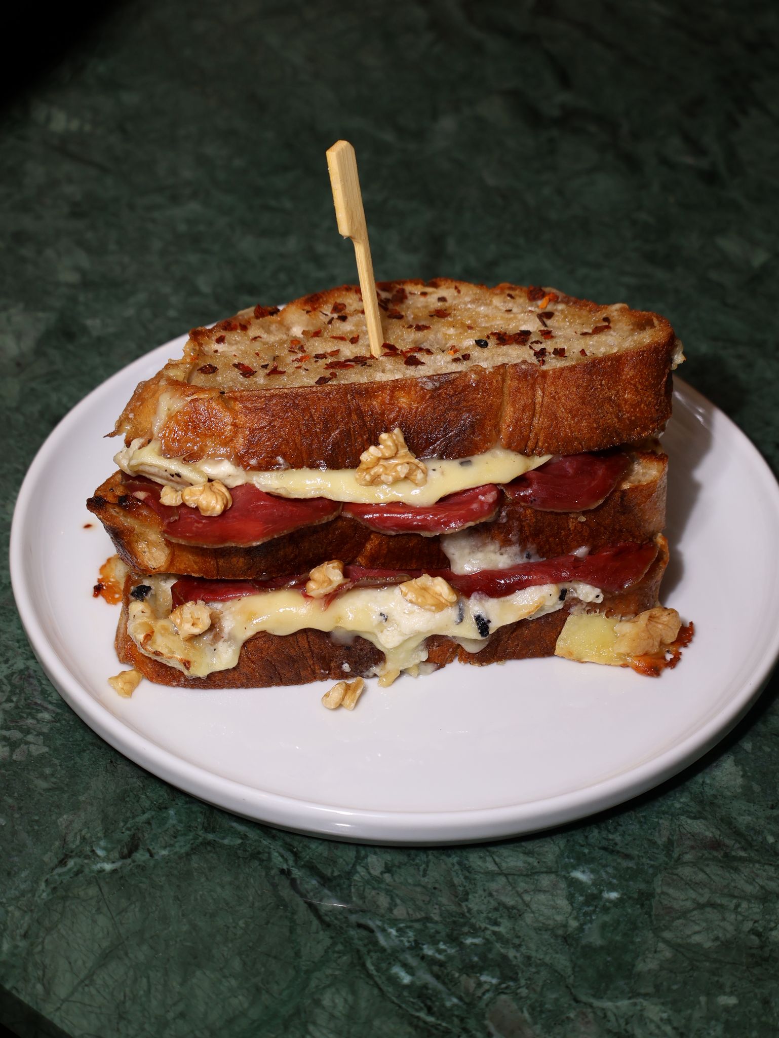 Pain de campagne grillé, bœuf séché et brie truffé maison. Le tout twisté de noix croquantes pour une touche de caractère.