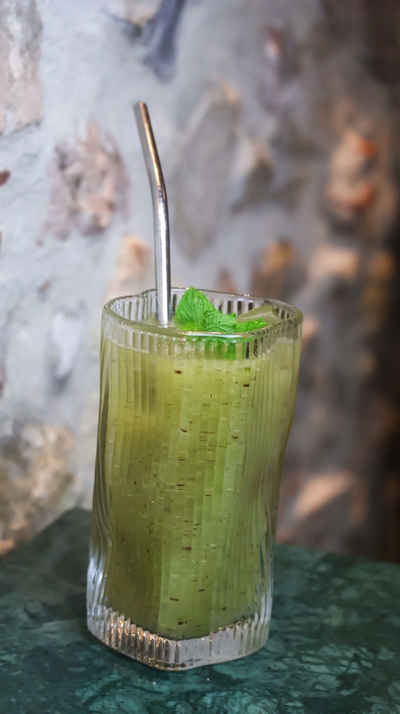 Un cocktail vitalité à base de kiwi, citron, menthe et concombre. Détoxifiant, éclatant et rafraîchissant : une explosion de fraîcheur verte.