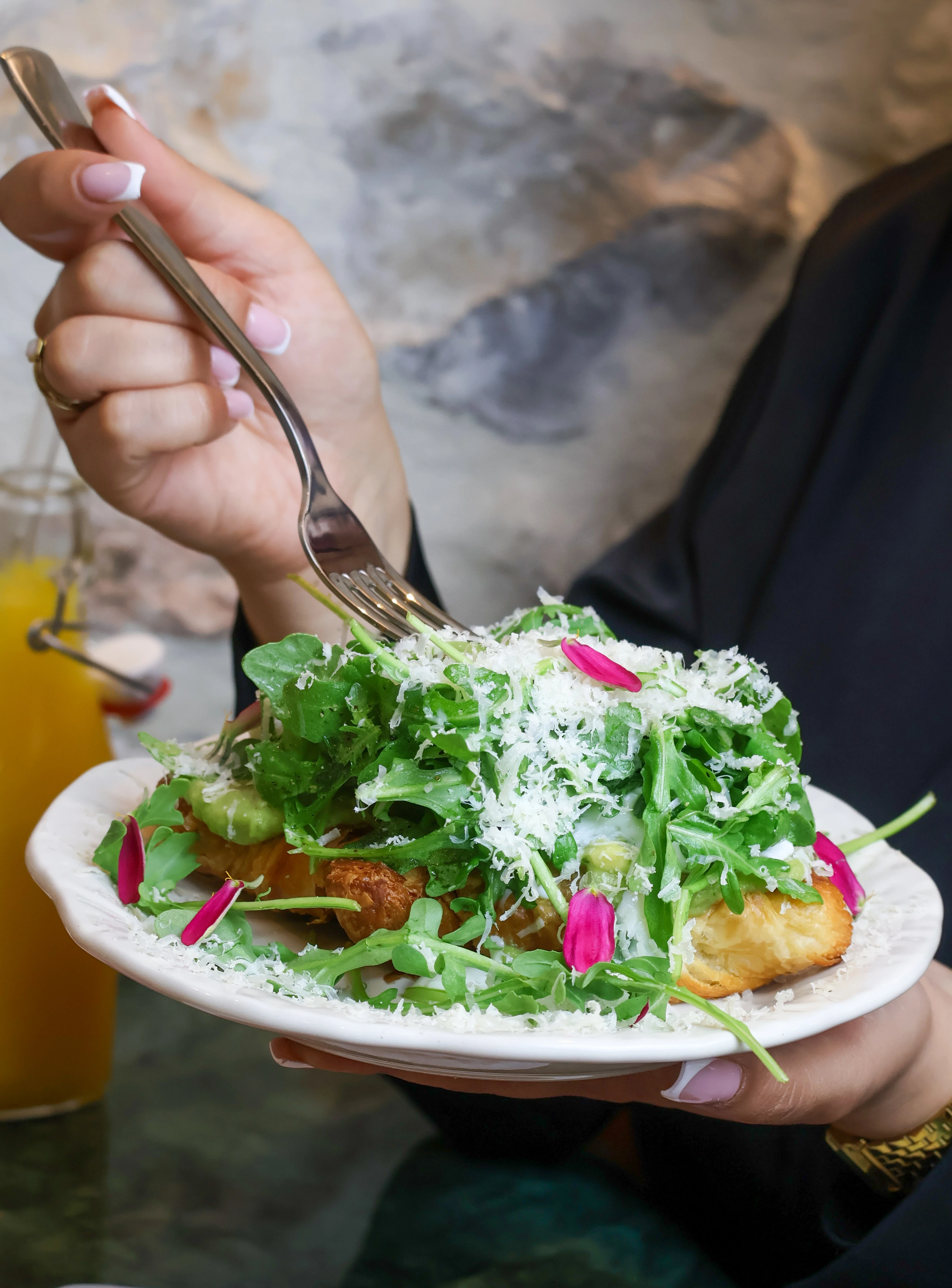 Croissant croustillant garni de guacamole maison, œuf poché fondant, roquette fraîchement assaisonnée et généreuse pluie de parmesan râpé.