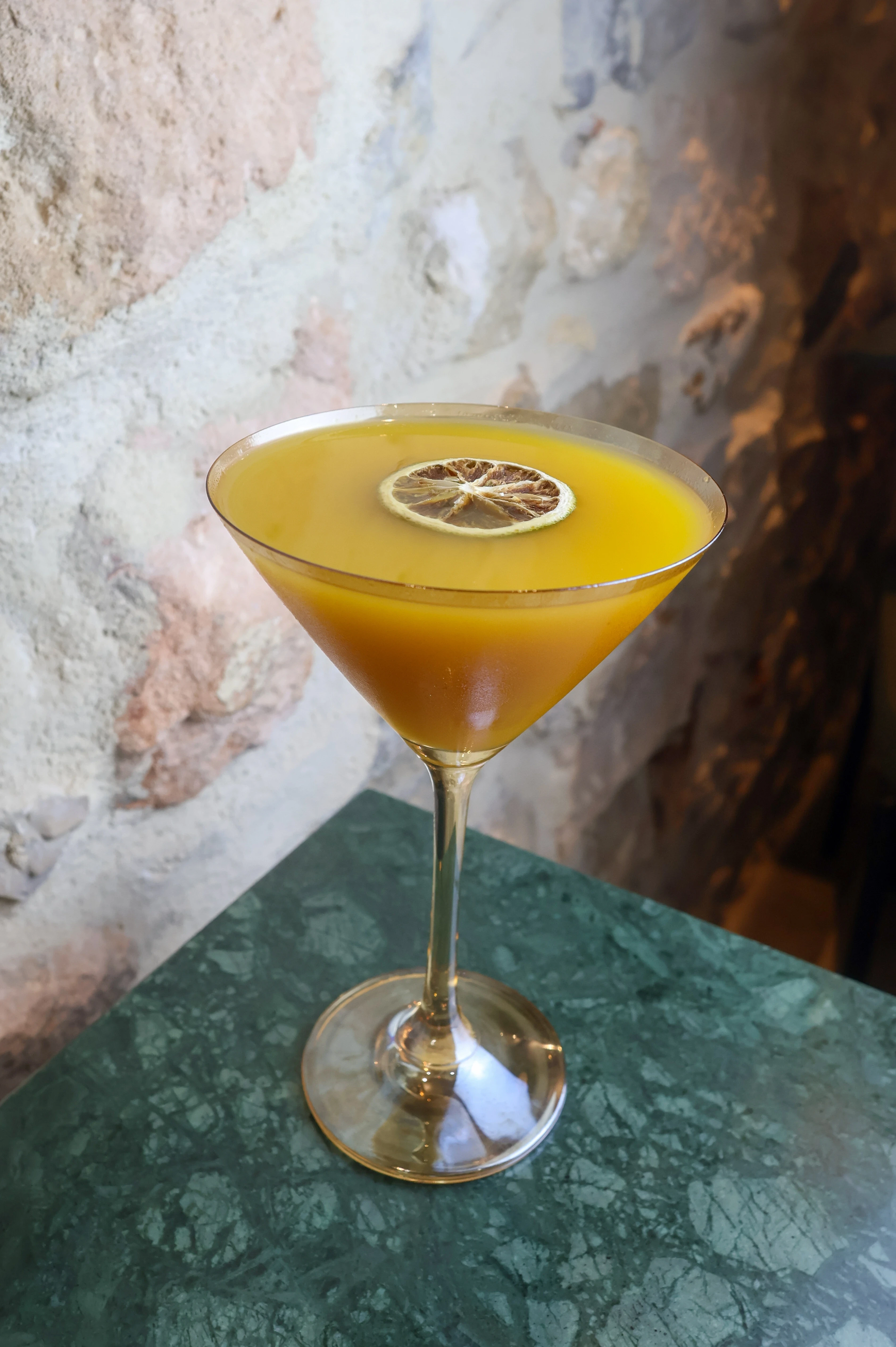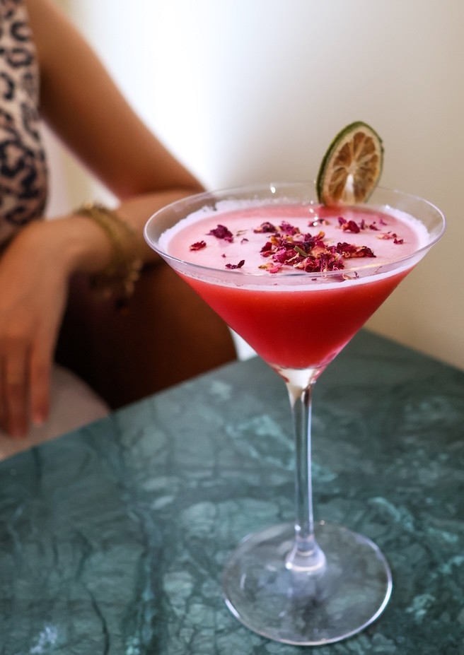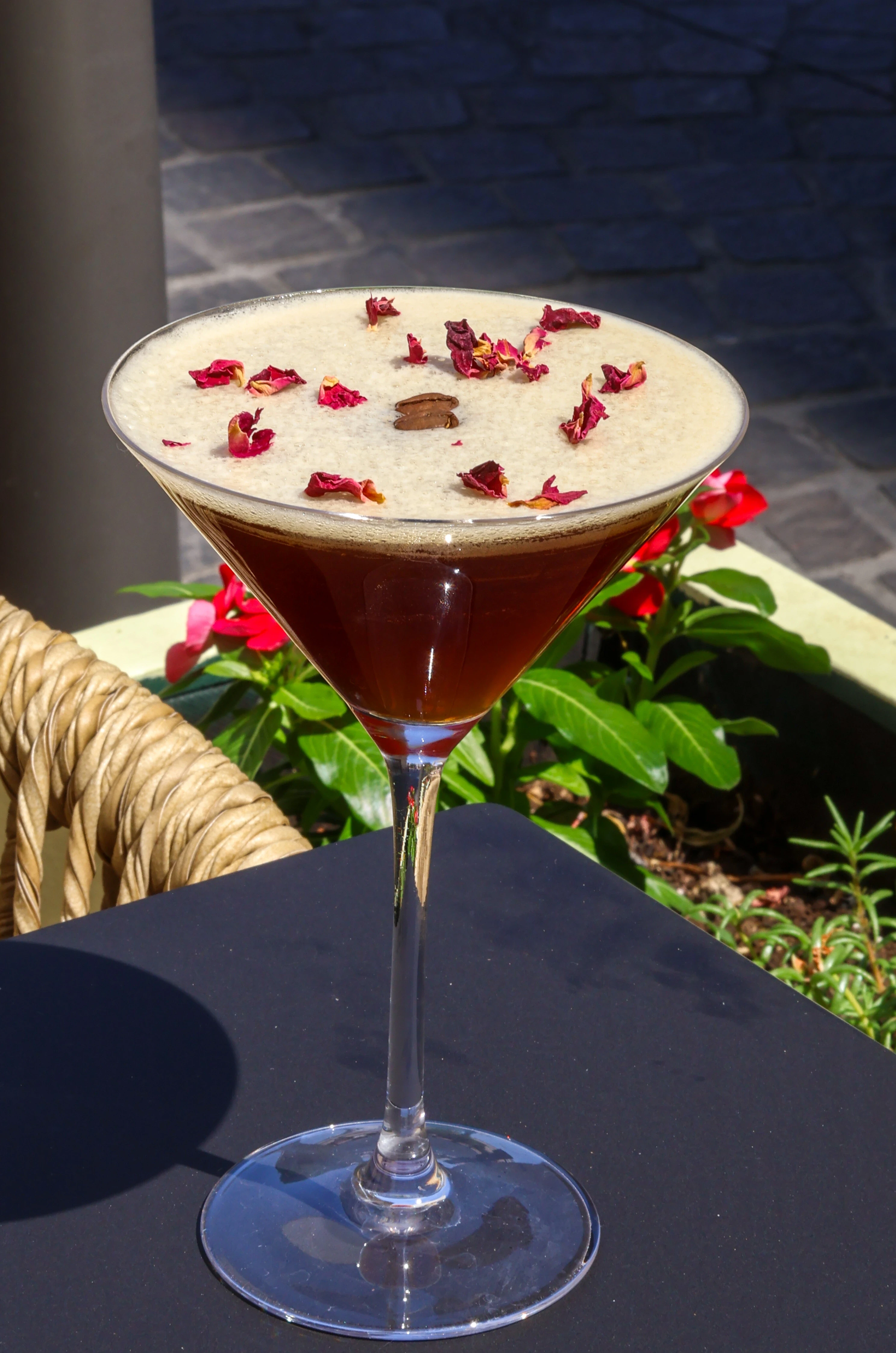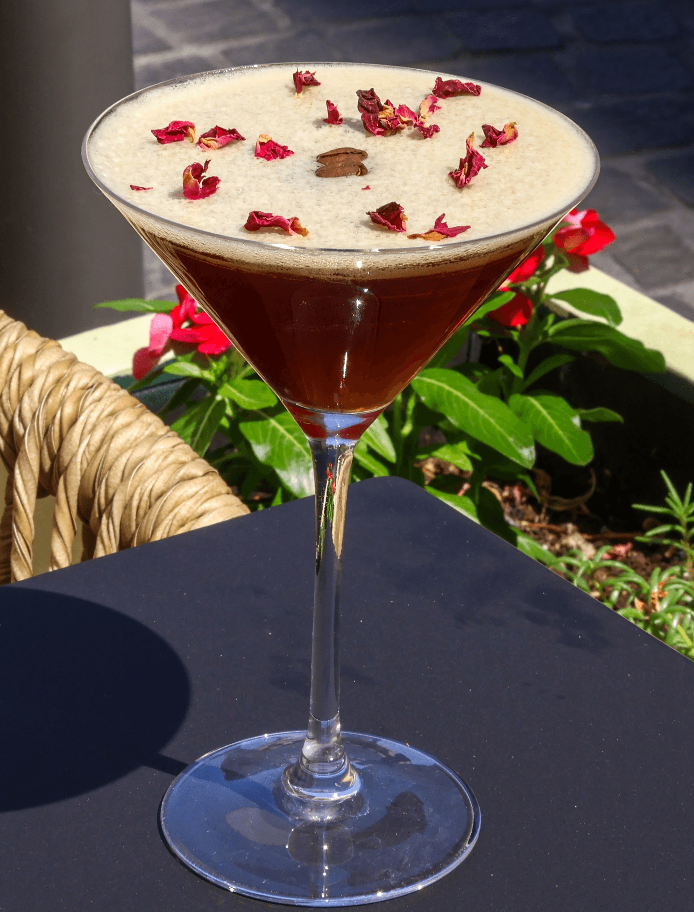 Café espresso infusé à froid, secoué sur glace pour une mousse aérienne. Servi dans un verre à cocktail et parsemé de pétales de rose.