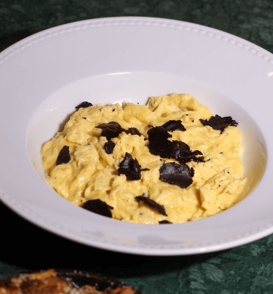 Œufs brouillés à la truffe noire, cuits lentement pour une texture fondante, relevés d’une sauce tartufata parfumée et nappés de fines lamelles de truffe noire.