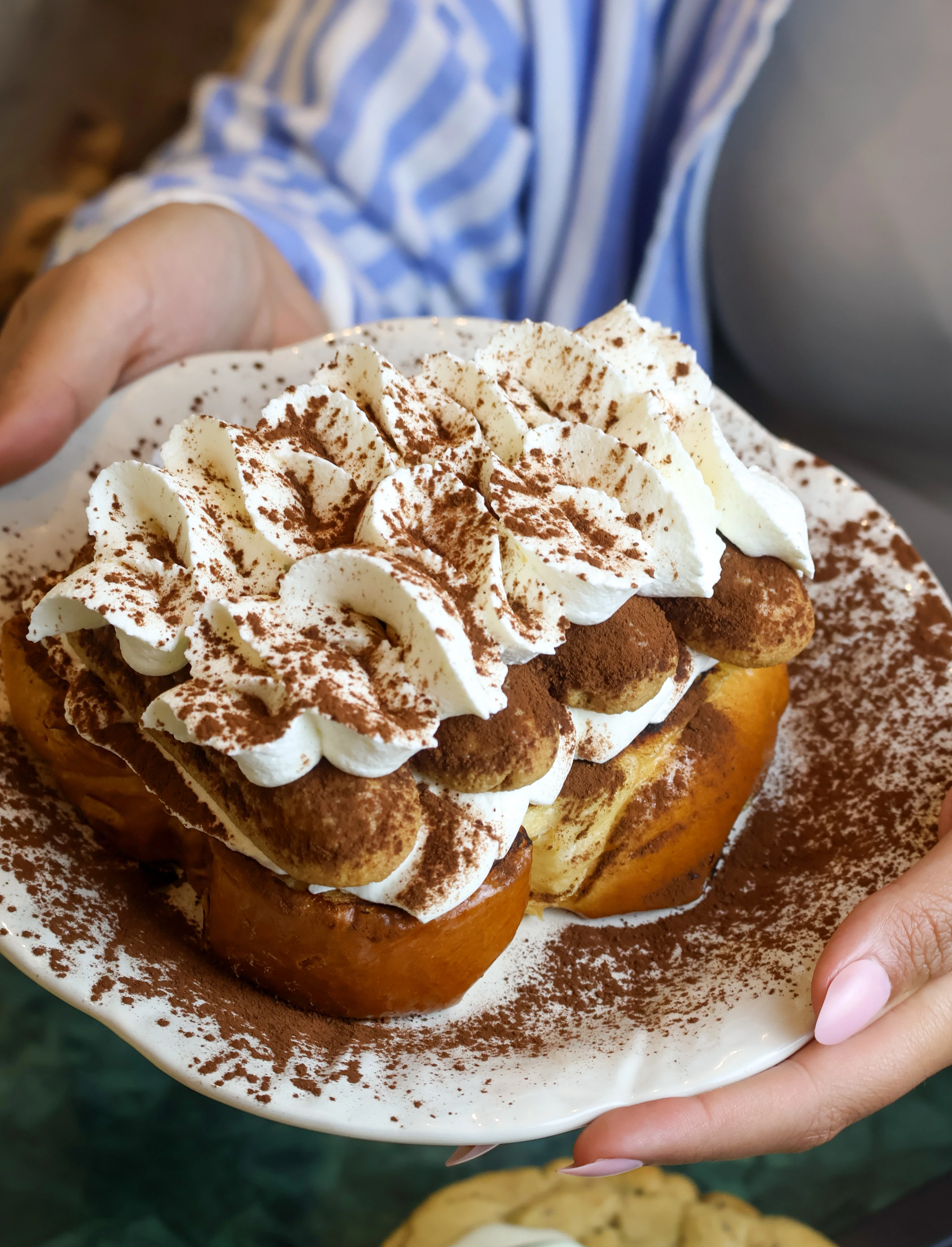 Brioche fondante façon pain perdu, généreusement garnie de chantilly aérienne, saupoudrée de cacao amer comme un véritable tiramisu.