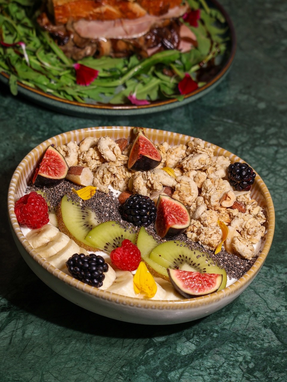 Base crémeuse de yaourt onctueux, garnie de granola croustillant, de graines de chia et d’un assortiment de fruits frais : figues, kiwi, banane, framboises et mûres. Un mélange équilibré entre douceur, croquant et fraîcheur.