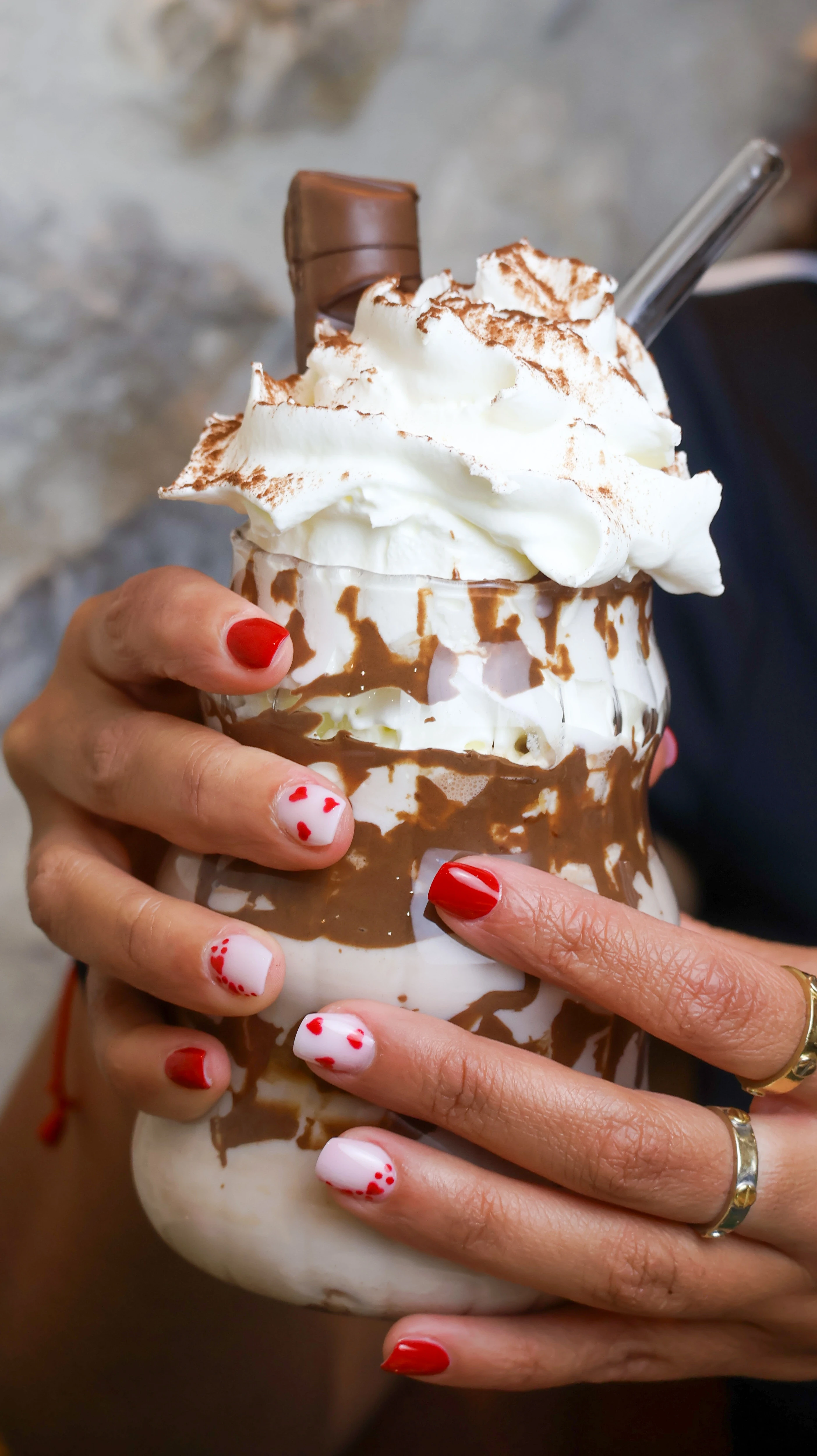 Un milkshake glacé ultra gourmand : lait frais, glace pilée, Nutella coulant, chantilly maison et un Kinder Bueno entier pour la touche finale. À déguster chaud ou froid ( Lait végétal +1 ).