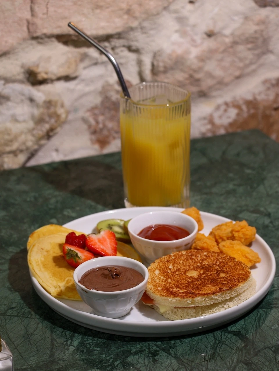 Un menu tout autant équilibré que gourmand, avec des chicken pops, un croque jambon, des pancakes, le tout accompagné d'un jus frais.