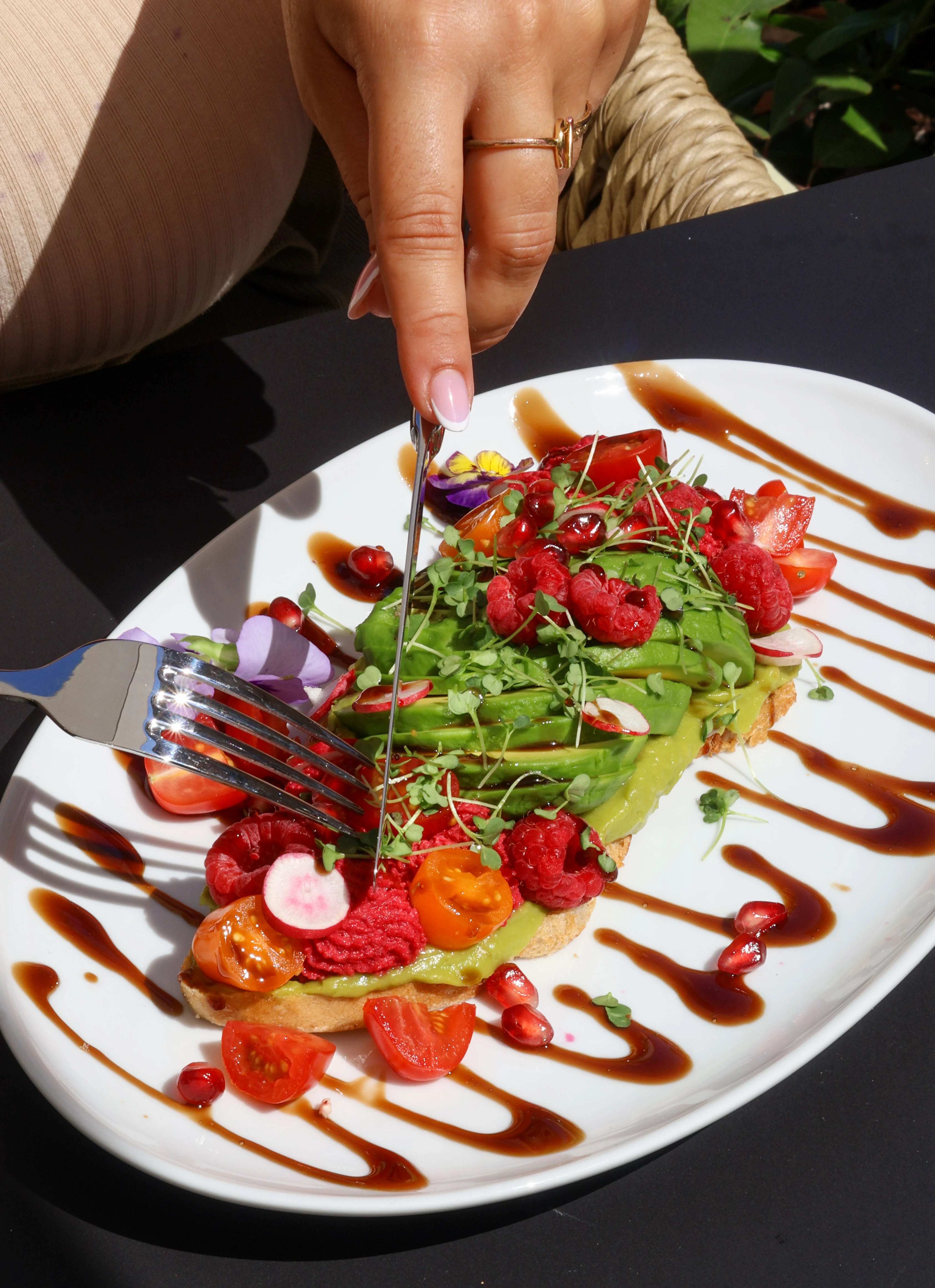 Pain toasté garni de fromage frais, guacamole onctueux, avocat, tomates cerises, radis, pousses fraîches, houmous de betteraves et de grenade.