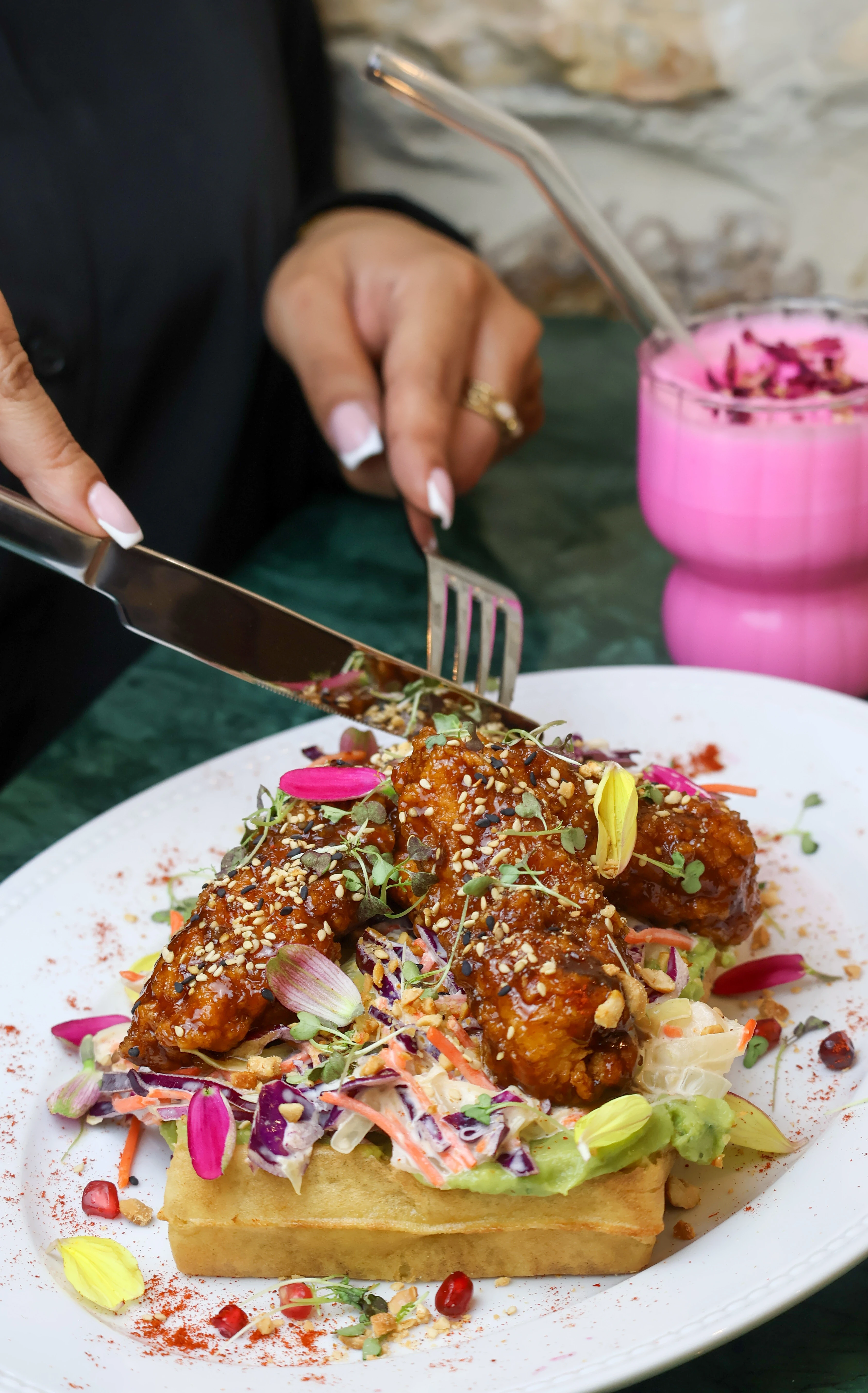 Gaufre moelleuse surmontée de tenders croustillants nappés d’une sauce sucrée-salée (miel, barbecue, gingembre, soja, sésame), de coleslaw et de guacamole.