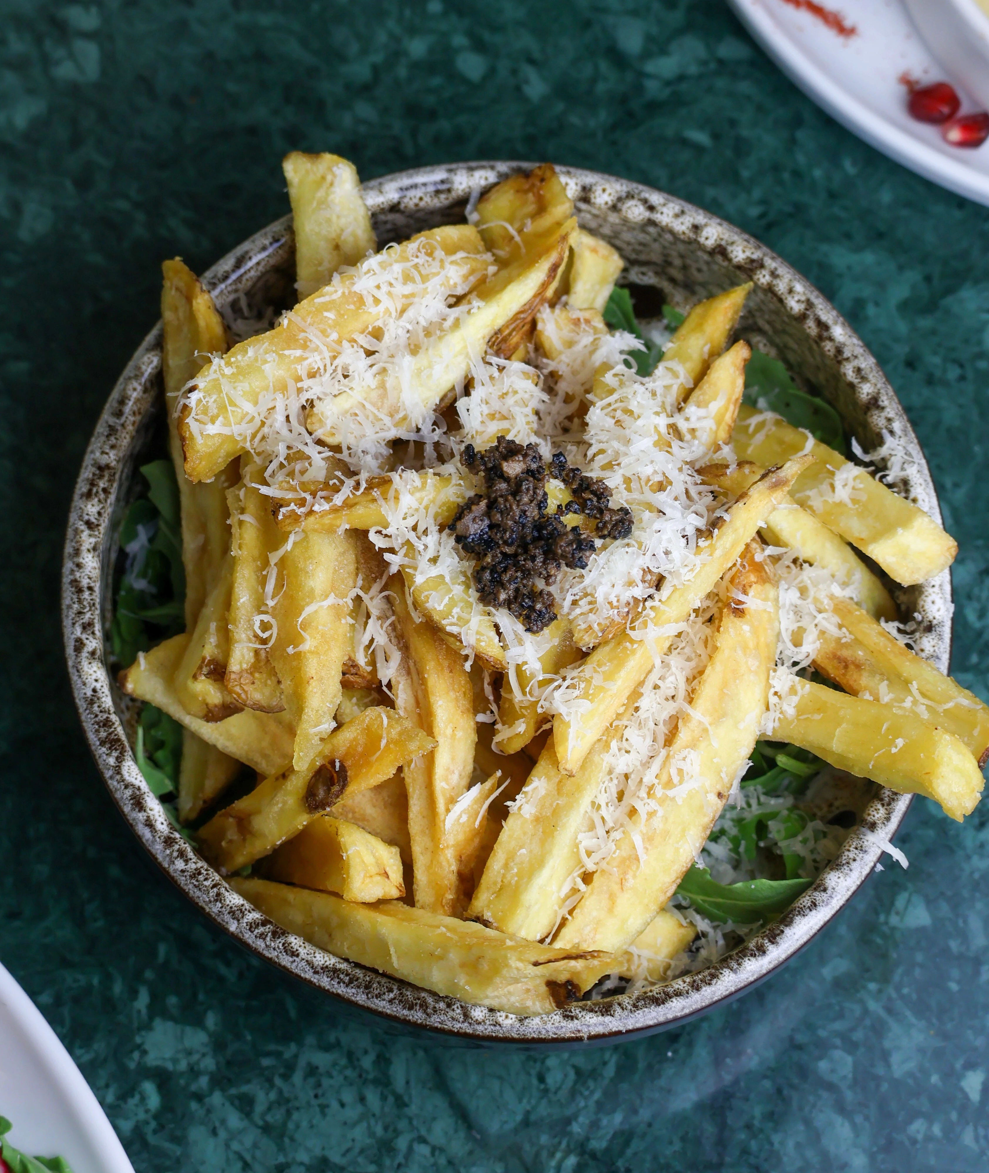Frites crousti-fondantes, parfumées à la truffe noire et nappées de copeaux de parmesan affiné. Le snack chic par excellence.