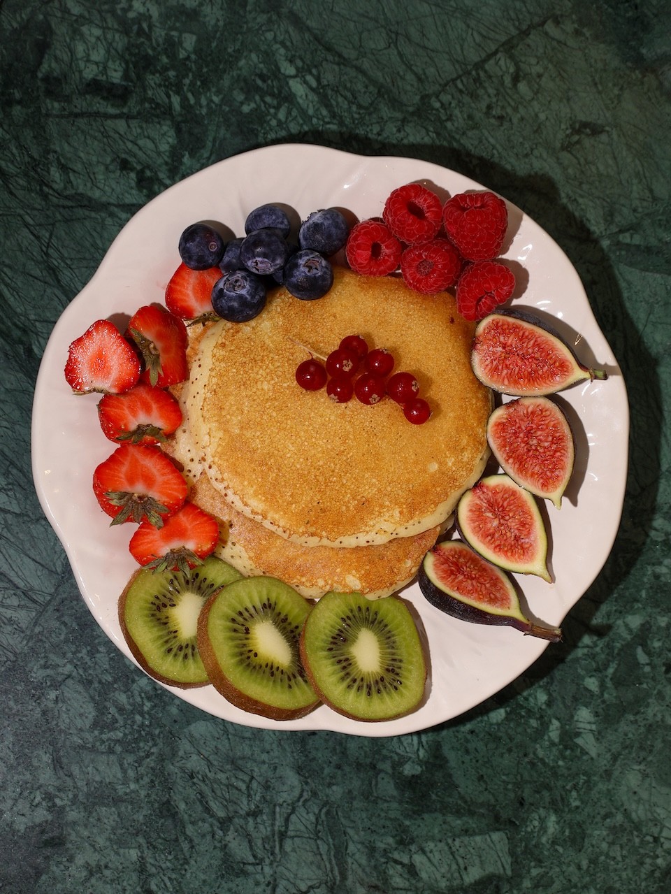 Pancakes moelleux servis sur présentoir avec Fruits rouges, Kiwi, Orange, Fruit de la passion, Sauce Chocolat.