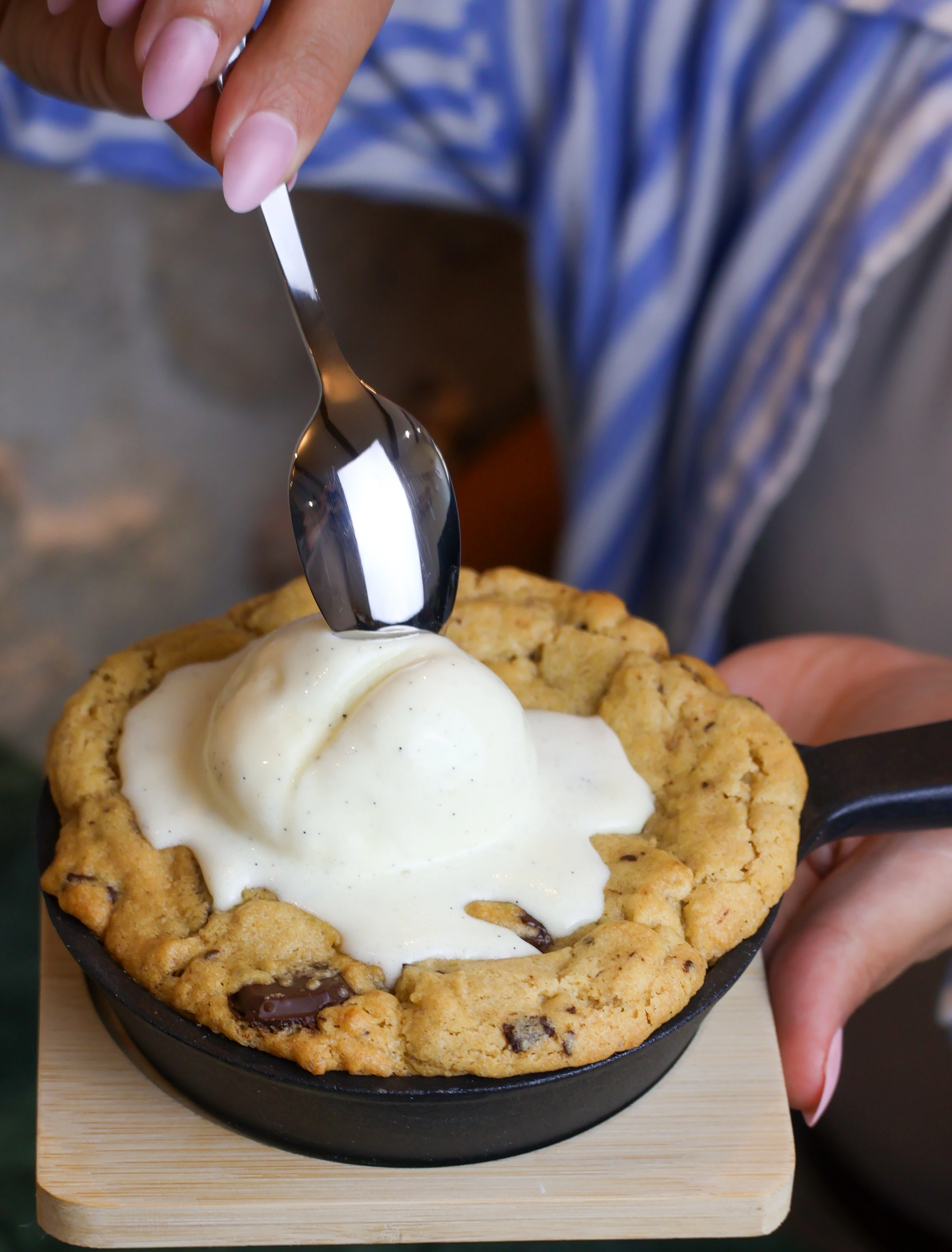 Alliance parfaite entre pâte à cookie moelleuse et cœur de brownie fondant au chocolat noir (nappé d'une boule de glace vanille artisanale).